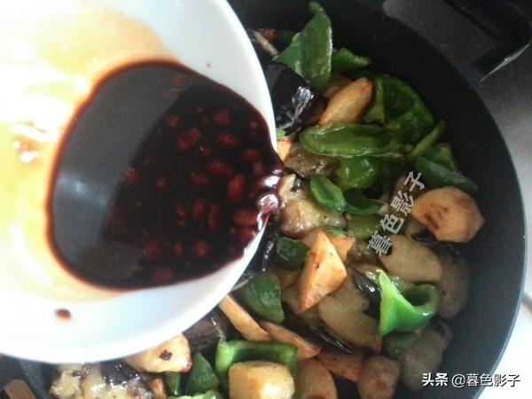 7,炸好的土豆和茄子大辣椒,备好菜谱里提及的佐料,全部倒进锅里翻炒吸收汤汁,加盐出锅。