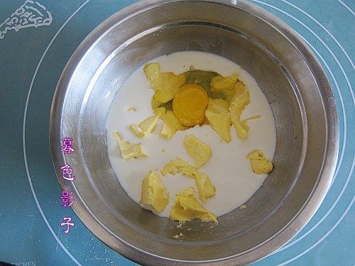 2,黄油在室温下软了就行,加牛奶和鸡蛋混合。