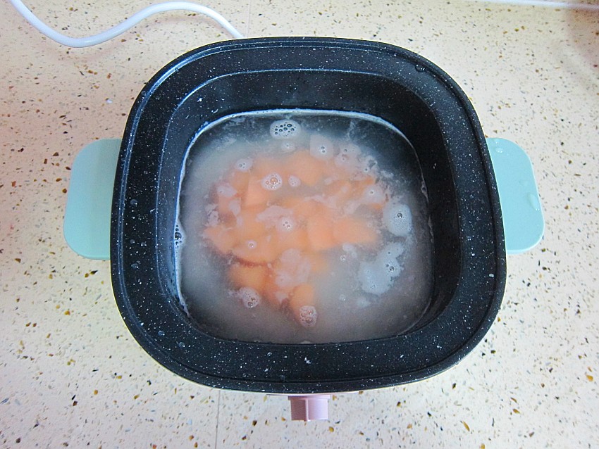 2,接通电源开大火,把淘洗的大米和切块的红薯放进锅内。
