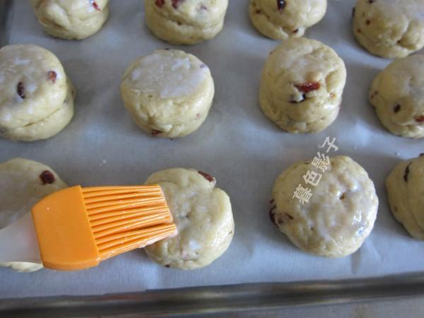 8,烤盘铺油纸,每一个司康之间留有空隙,然后在表面刷牛奶。