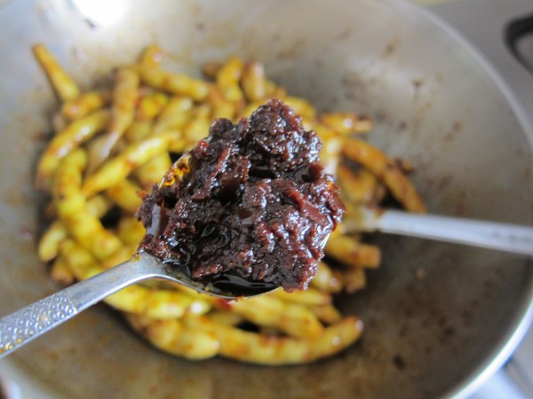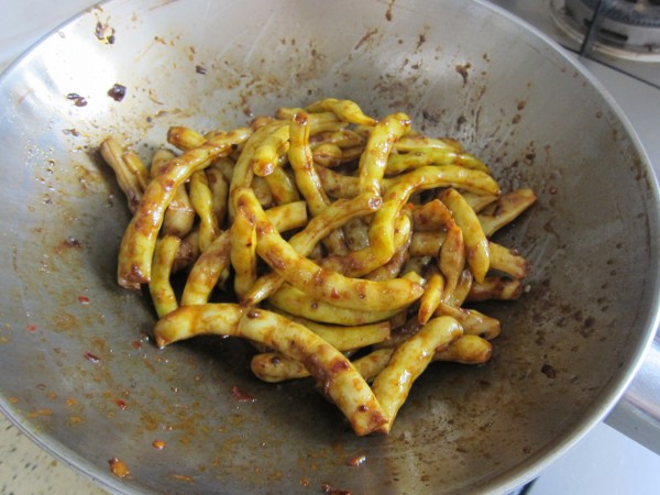 5,翻炒到豆角全部变色,加豆豉辣椒酱,小火盖锅焖5分钟左右