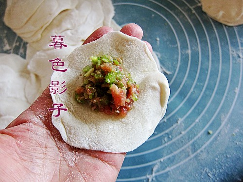 4,取1个面皮包入适量的馅料,捏牢饺子的边缘免得露馅。