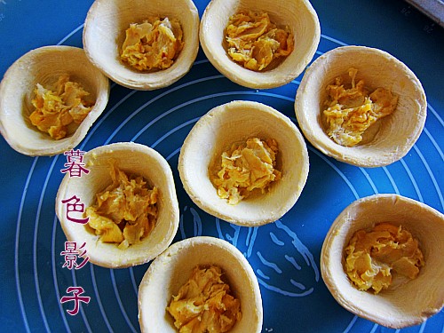 3,将适量的榴莲果肉放进挞皮里边。