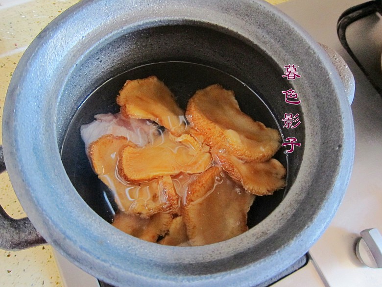 5,泡好的猴头要挤出水份,冲洗干净,切成片也放进砂锅内煲汤。