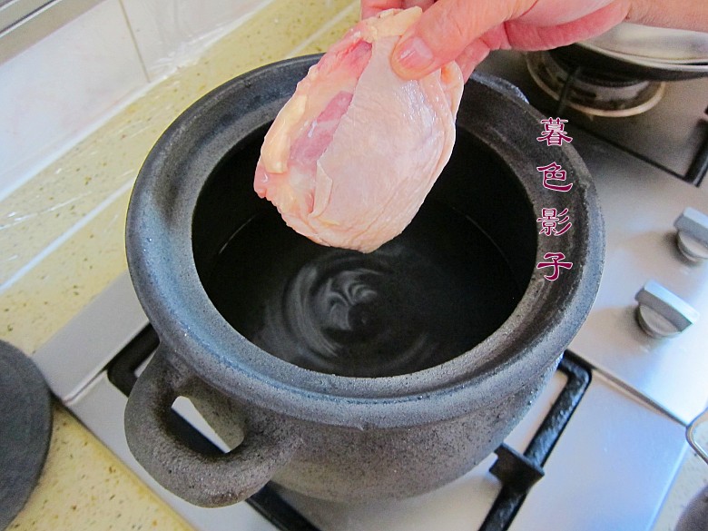4,将洗干净的鸡肉块放进砂锅内,加1勺料酒去腥腻味。