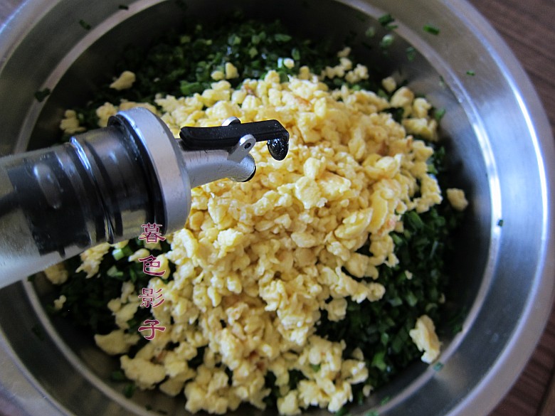 制作步骤:1,鸡蛋打散炒碎了,这样不用刀切鸡蛋了。,韭菜洗干净控下水,然后切碎和炒好的鸡蛋放在一起,先不要加盐哈,包的时候加盐。这样会减少菜的水分流失。先放植物油把菜都搅拌好就行了。
