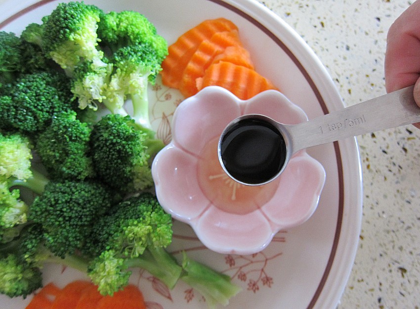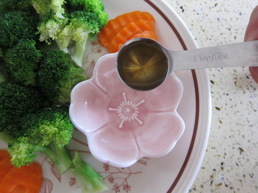 食材;西兰花1棵,味美达清香米醋1勺,柠檬蒸鱼酱油1勺,橄榄油适量。