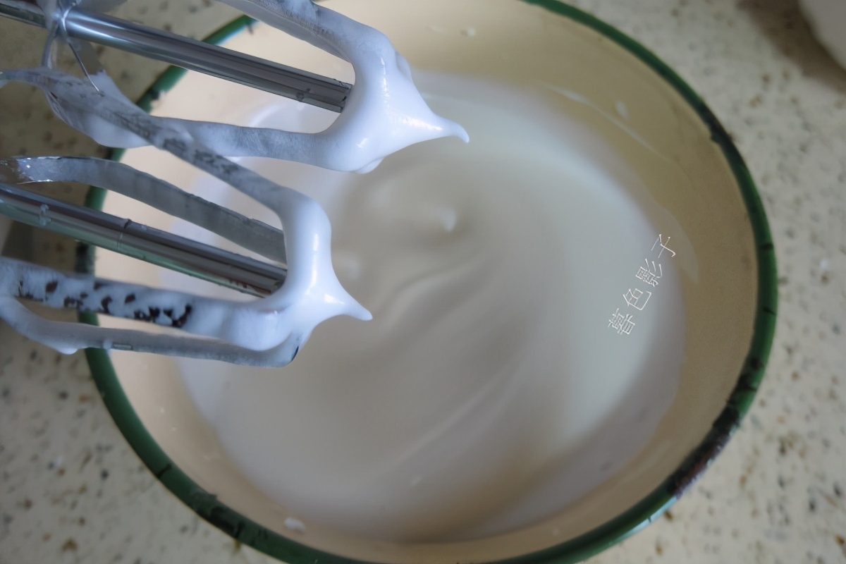 3,鸡蛋清和蛋黄分开放,用电动打蛋器打发蛋清,期间分2次加糖。提起打蛋器的时候前边有个小尖就可以了。