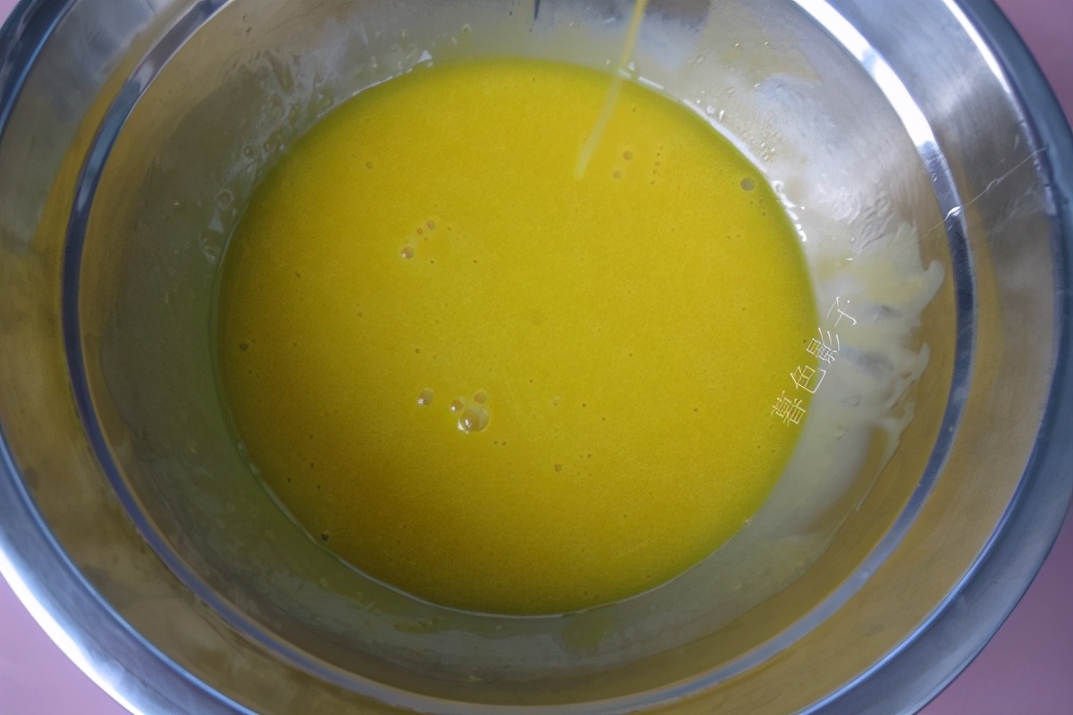 制作步骤;1,鸡蛋黄和植物油水搅打混合融合。