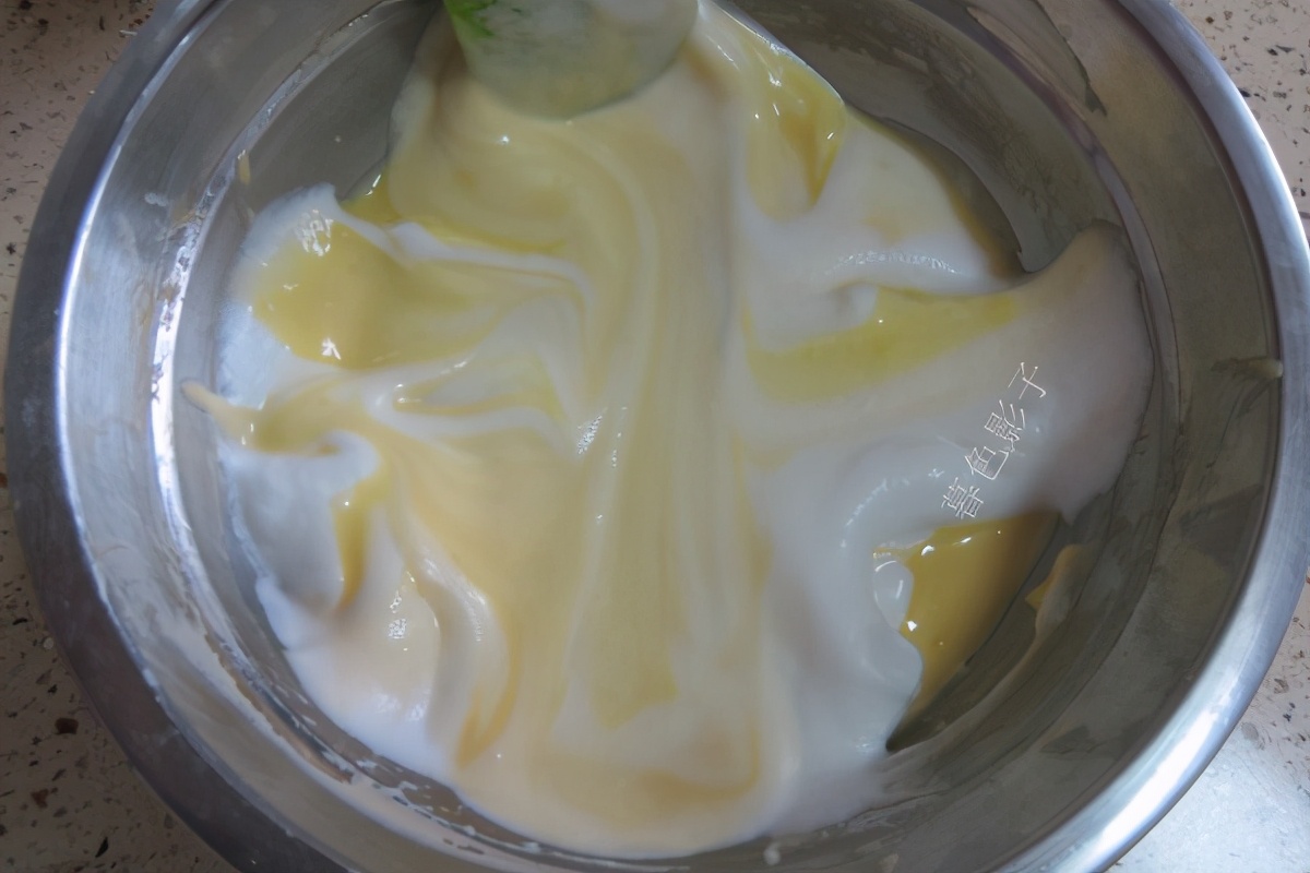 4,将蛋黄糊和蛋清混合,注意手法不要转圈,免得消泡。上下翻拌就就可以。