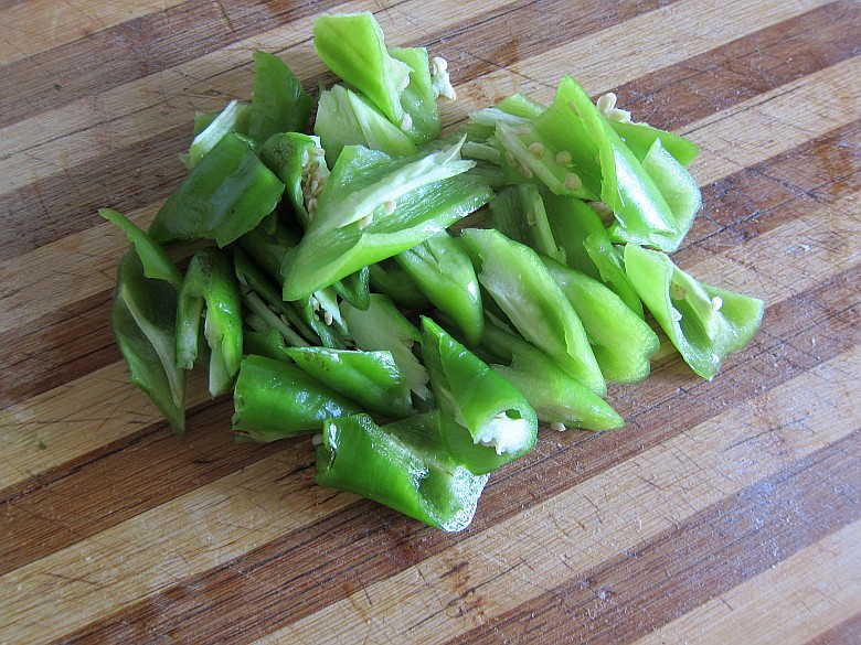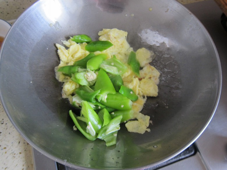 鸡蛋液凝固了,将切好的小辣椒下锅翻炒。