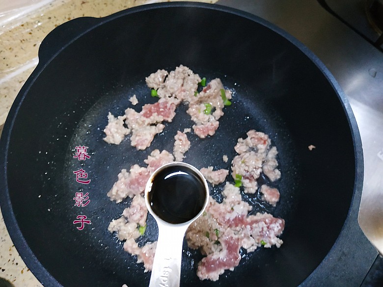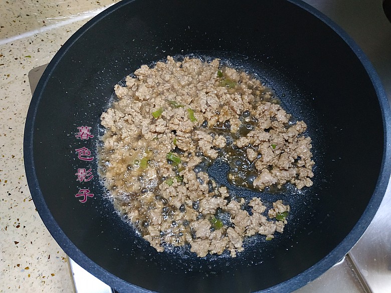 3,热油下锅,葱花爆出香味,炒肉沫,加料酒和生抽。