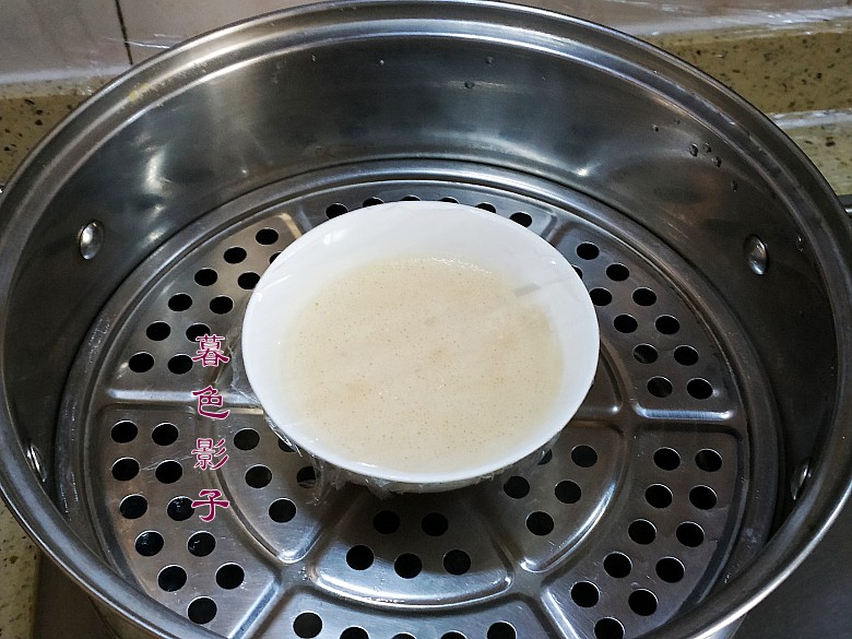 5,鸡蛋打散,加适量的水,过滤1次。碗上包保鲜膜扎几个小洞,热水放锅里蒸10分钟左右就行了。
