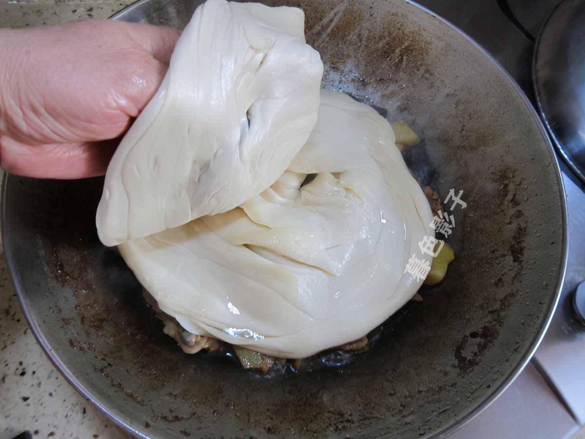 7,将做好的千层饼盖在锅里的菜上边,焖几分钟。