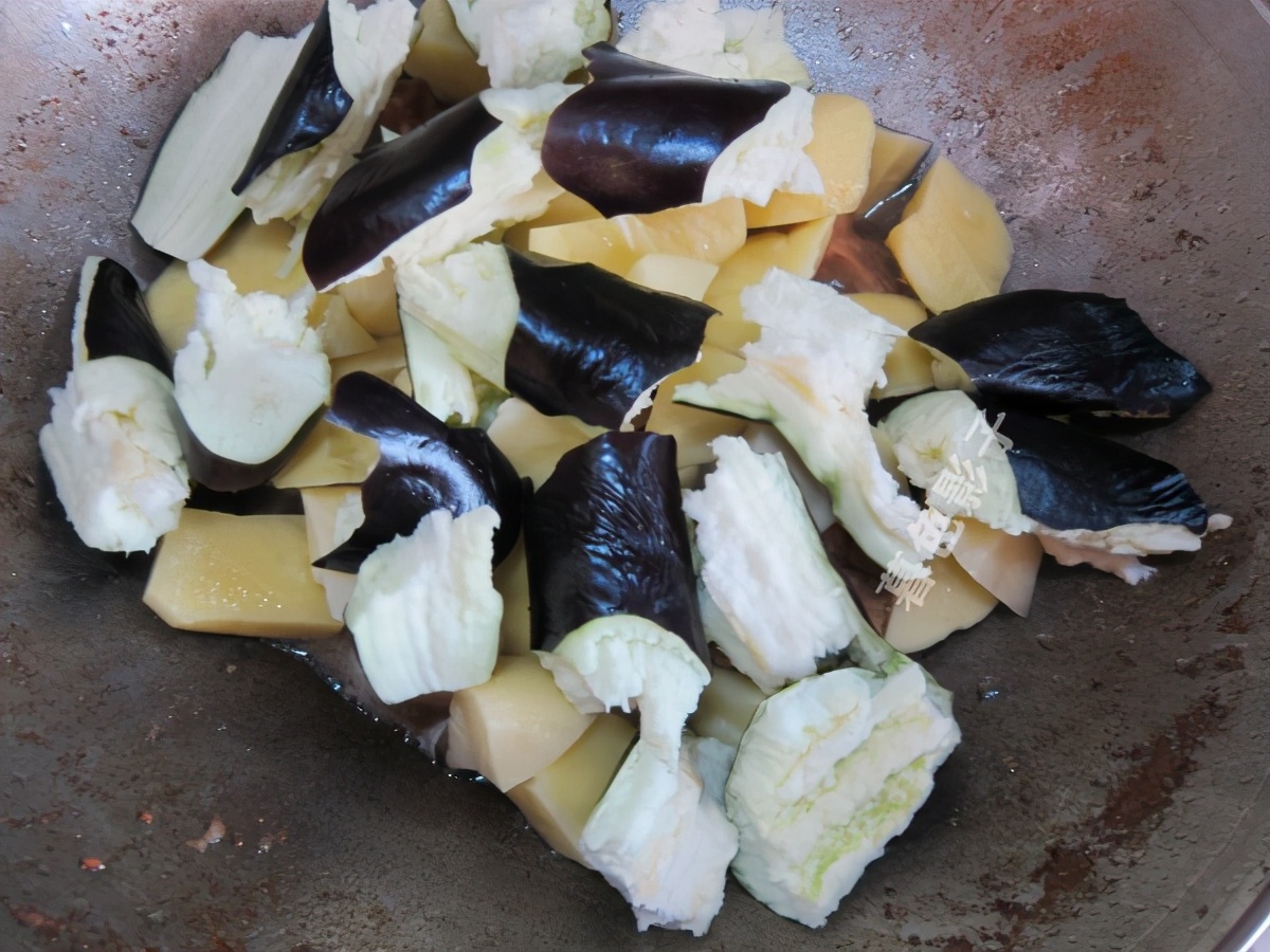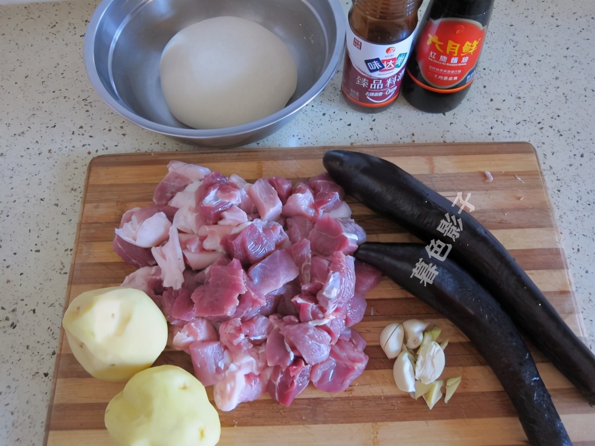 制作步骤;1,备好主要的做菜的食材,土豆和茄子,肉都需要洗干净然后切块,
