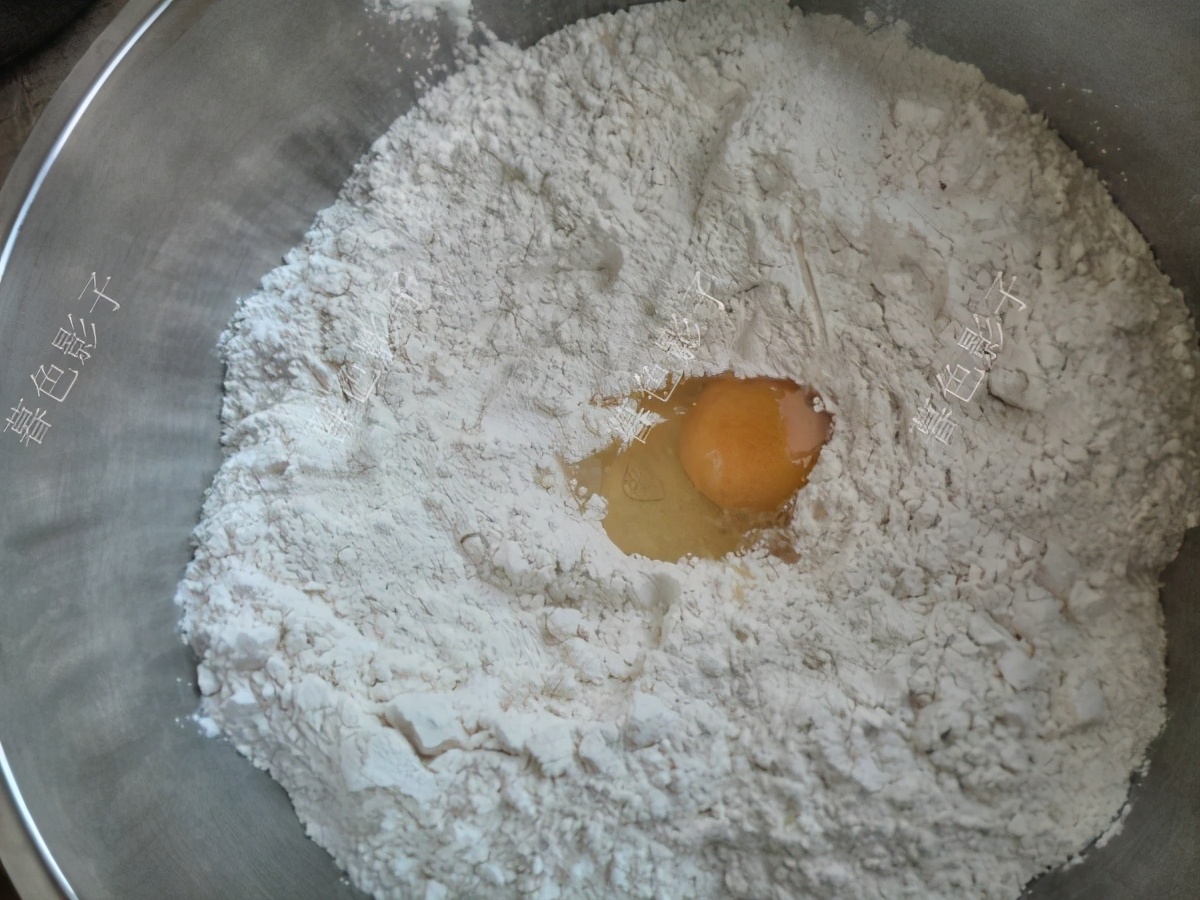 2,面粉加鸡蛋混合均匀,用温水和面。揉成光滑的面团,密封松弛30分钟左右。