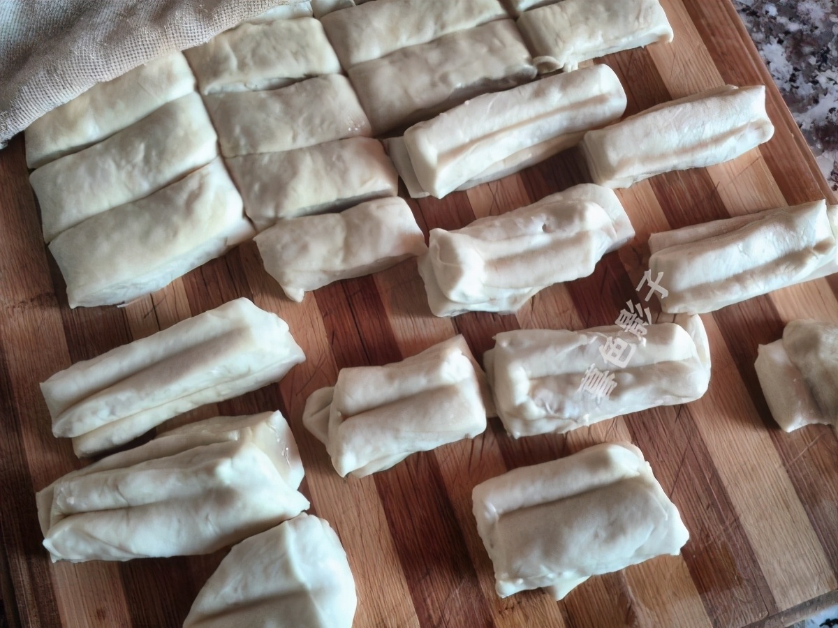 5,用刀切成条状,这要看你炸油条的锅多大,再切合适的面,切好的面上边刷点油取二个面条重叠,用筷子压一下。