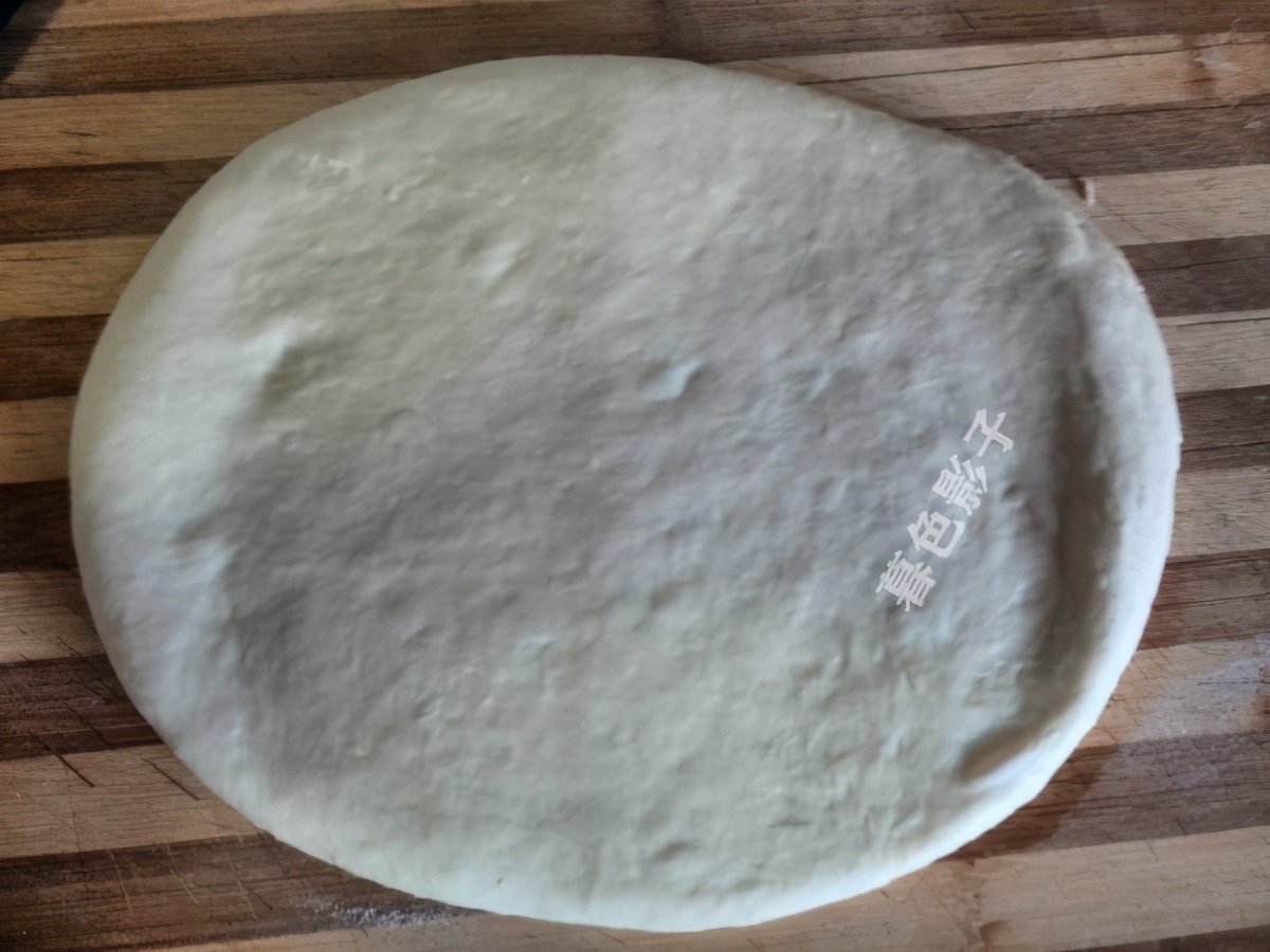 4,揉成光滑的面团,密封松弛30分钟左右,面团松弛好了,再将面团擀成饼一样的厚薄,大约2CM左右。