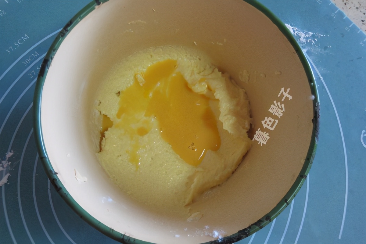 在打发的黄油里分次加鸡蛋液,然后混合均匀,再加蛋液直至加完为止。