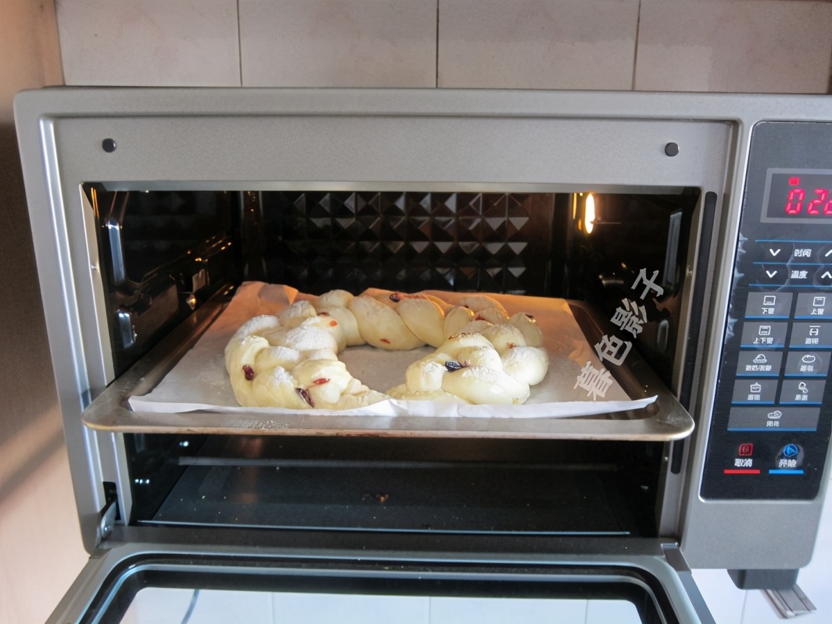摆放进铺油纸的烤盘里边,放温暖处进行2次发酵。刷鸡蛋液,洒上干面粉。