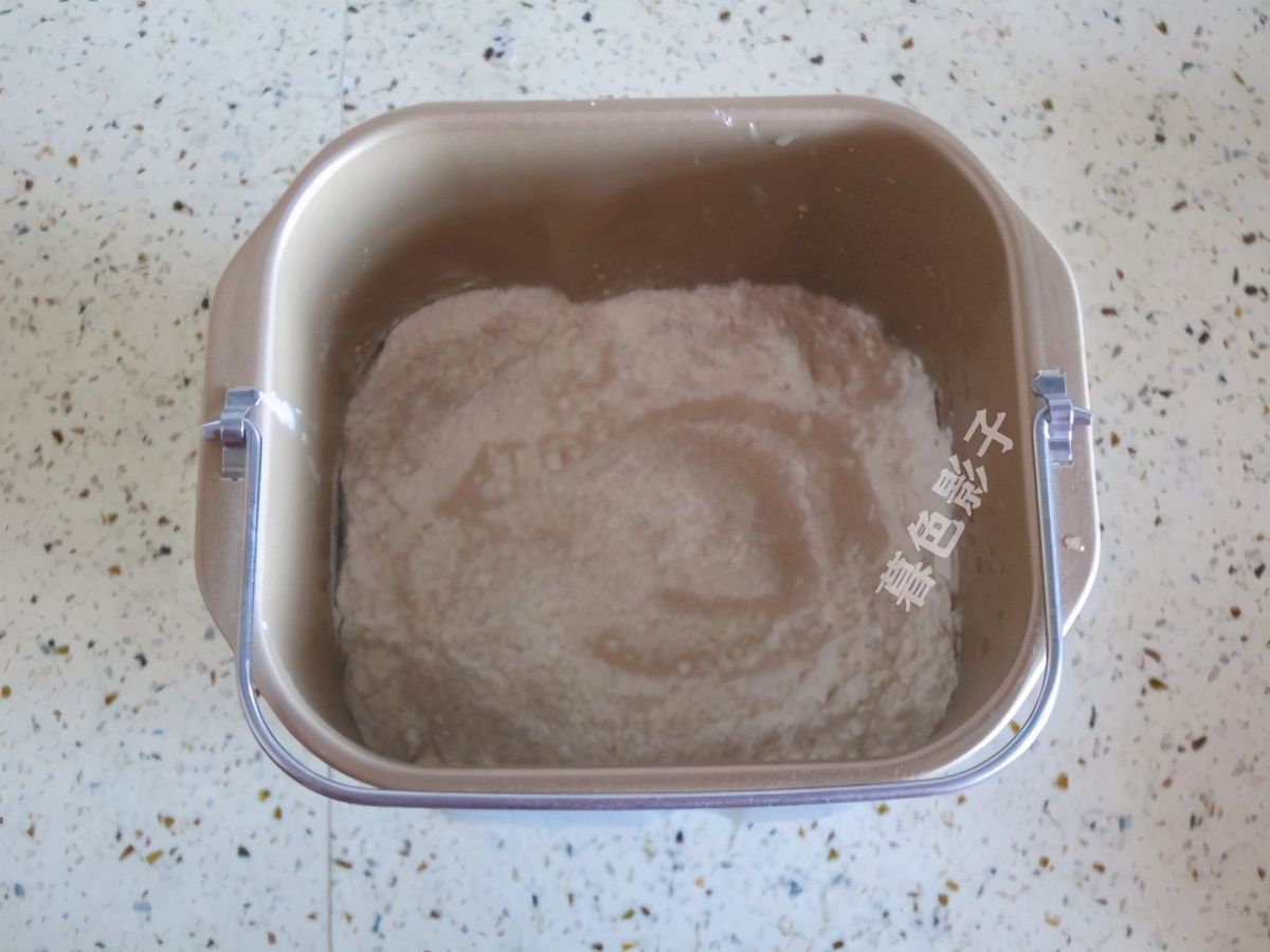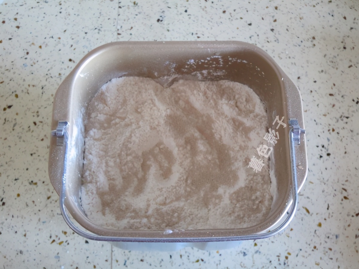 加250克面包粉在面包桶内,面上撒1半的酵母粉。