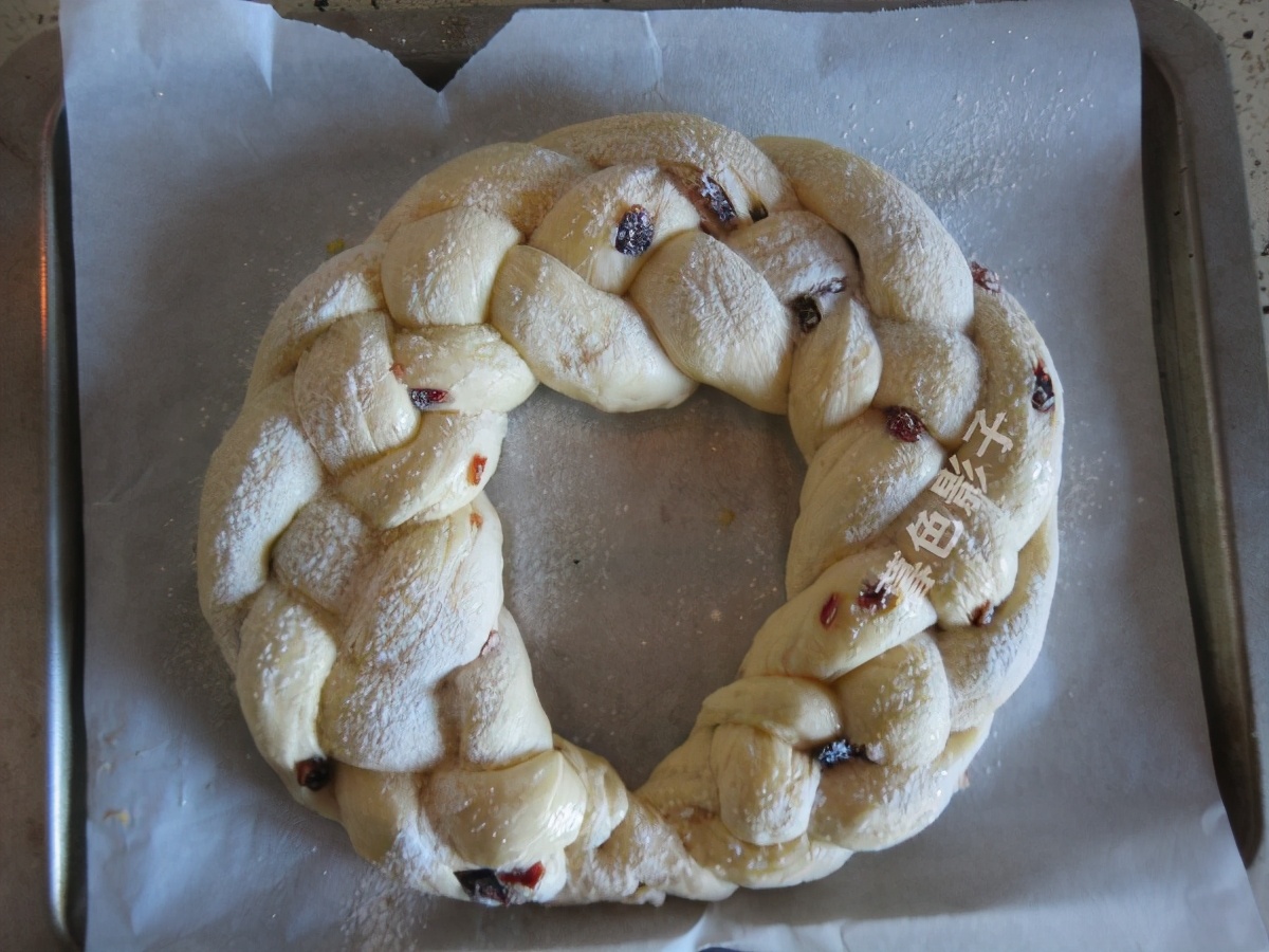 这是完成了的花式辫子面包。如如果会编六股的辫子更漂亮。