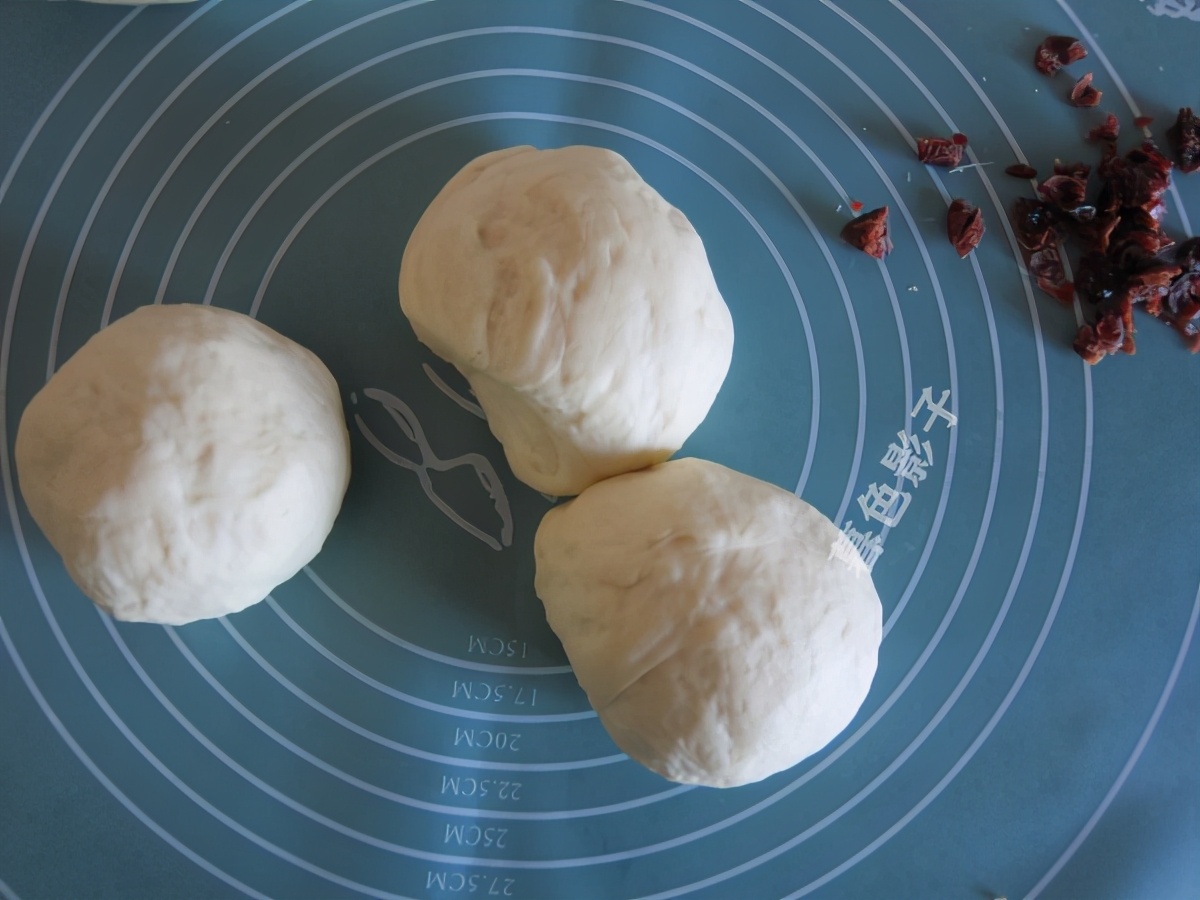 分成小块大约120克左右,准备做辫子面包了。我临时想起来加点蔓越莓干,切一下备用。