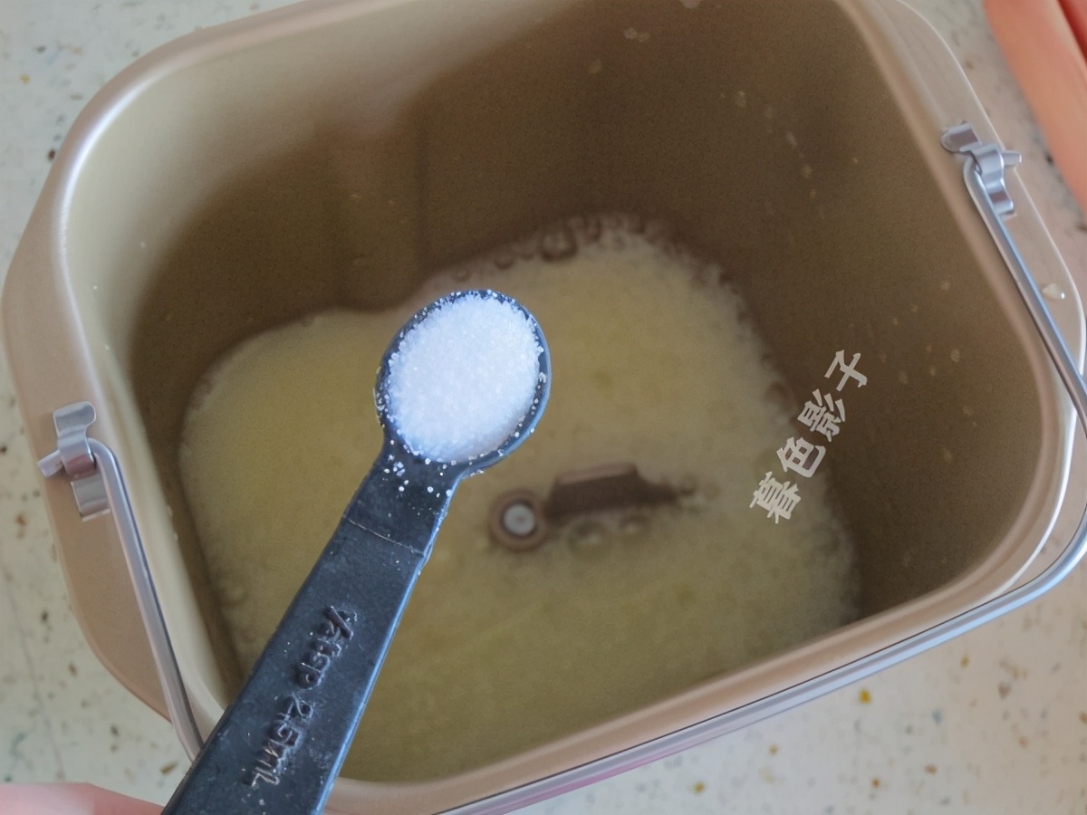 在混好已溶和的液体内加1勺盐,这款是适合高糖人吃的面包。