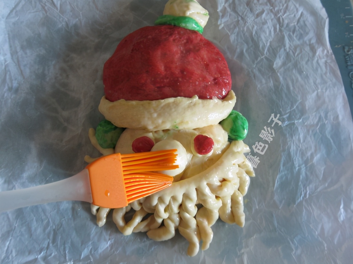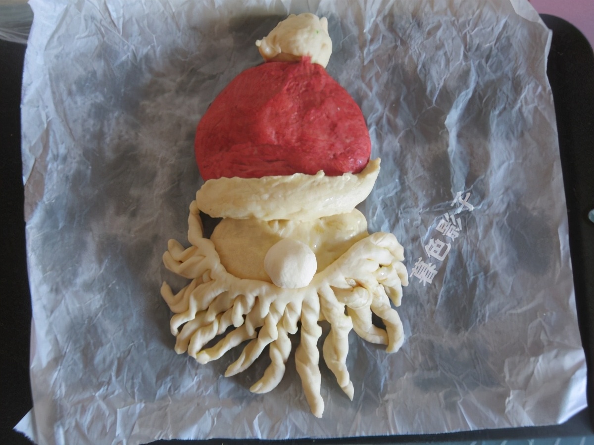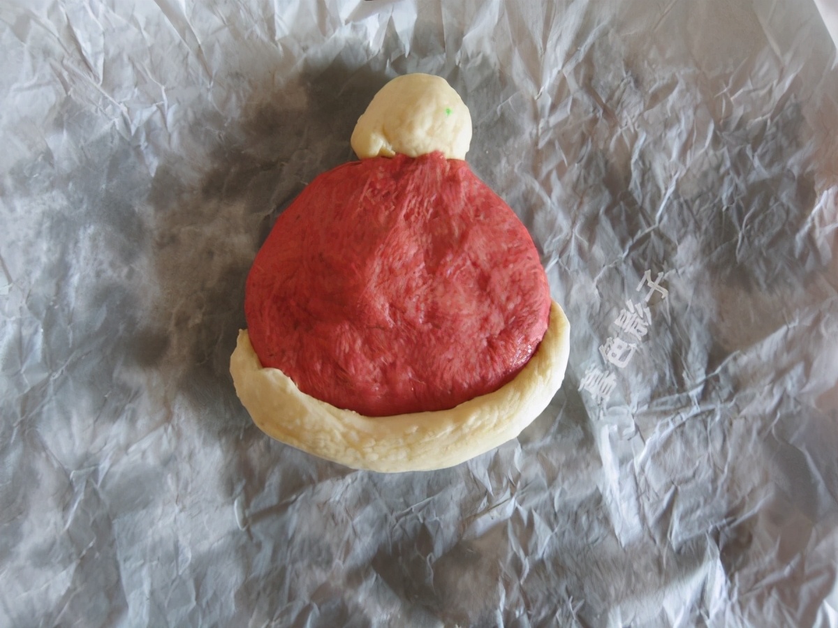 红色面团擀压一下形状和帽子一样,顶部装饰上一个白色的球,再把帽檐装饰上,如果怕烤的时候掉下来,抹点水粘合一下。
