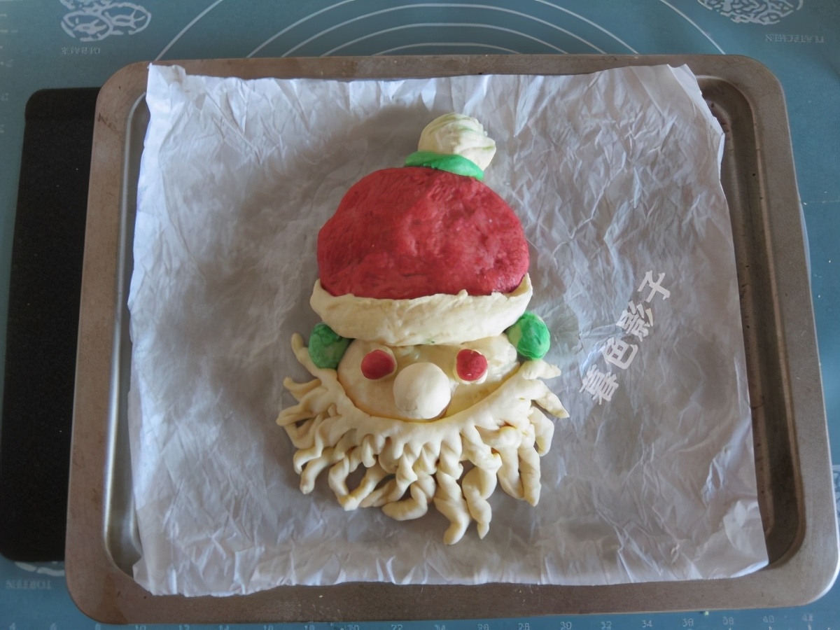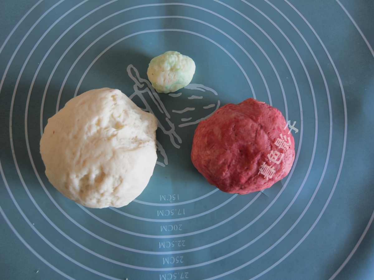 分成小块加红曲粉和成1个小面团,做圣诞老人的帽子,绿色一个小小的团即可。