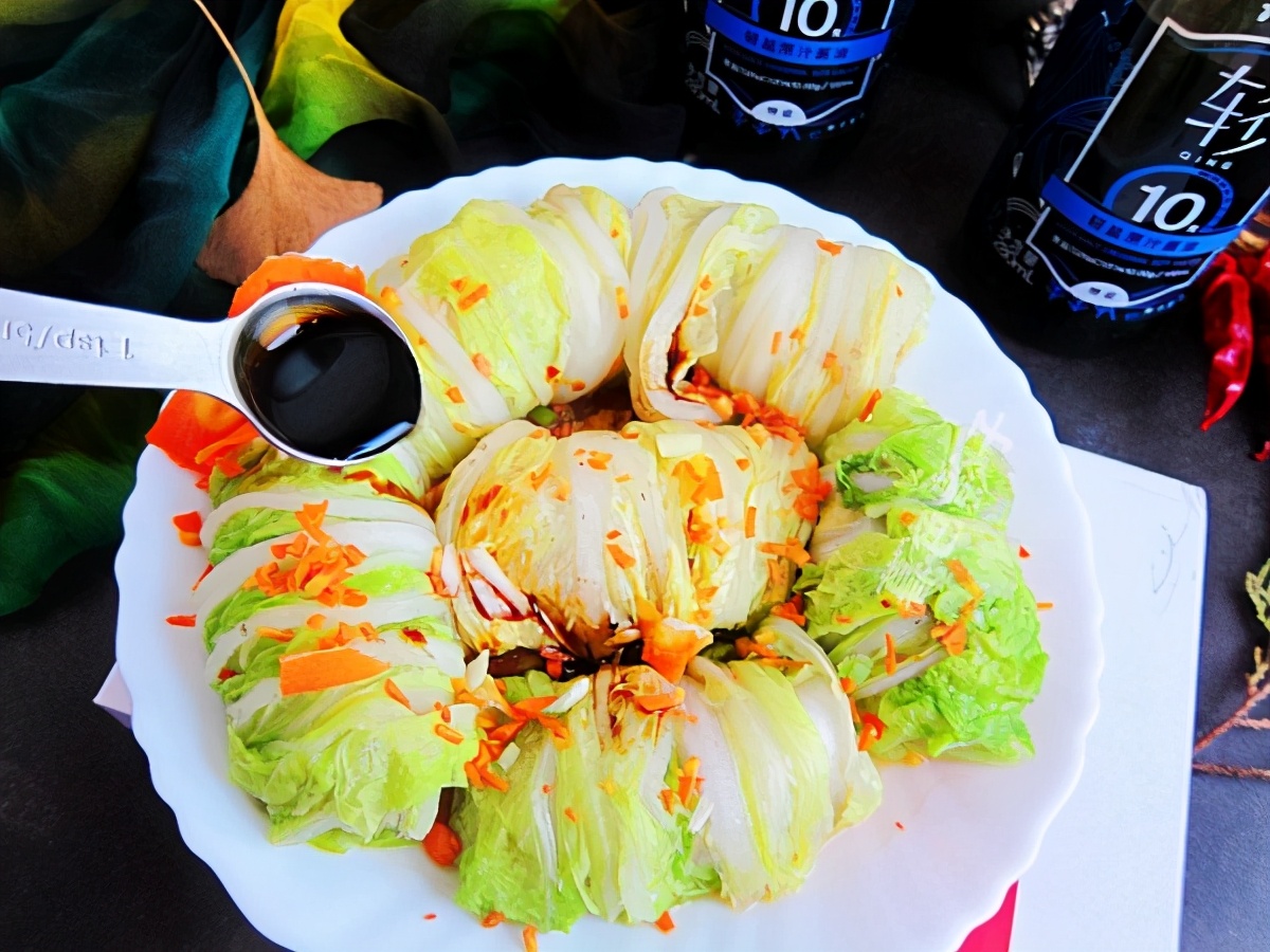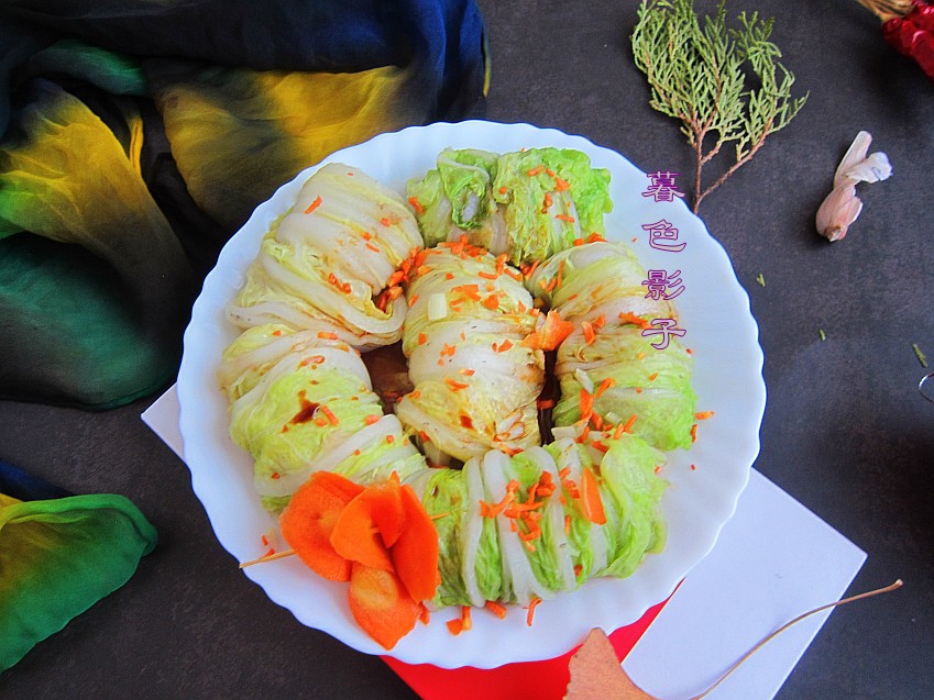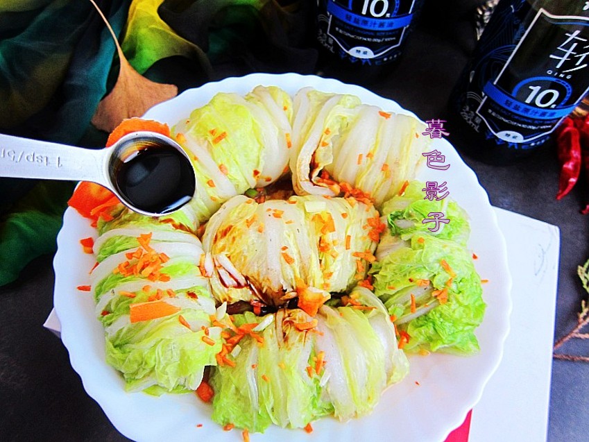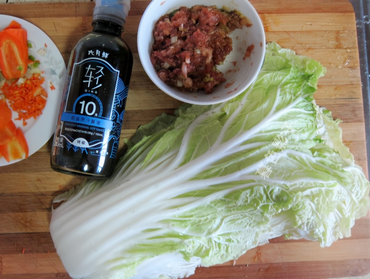 食谱;白菜猪肉卷,食材;肉馅200克,植物油1勺,盐1勺,酱油2勺,白菜6片,胡萝卜适量,蚝油1勺,葱花适量。