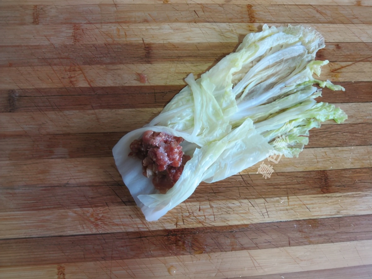 白菜的梗子要切掉了。不然包裹不上肉馅。