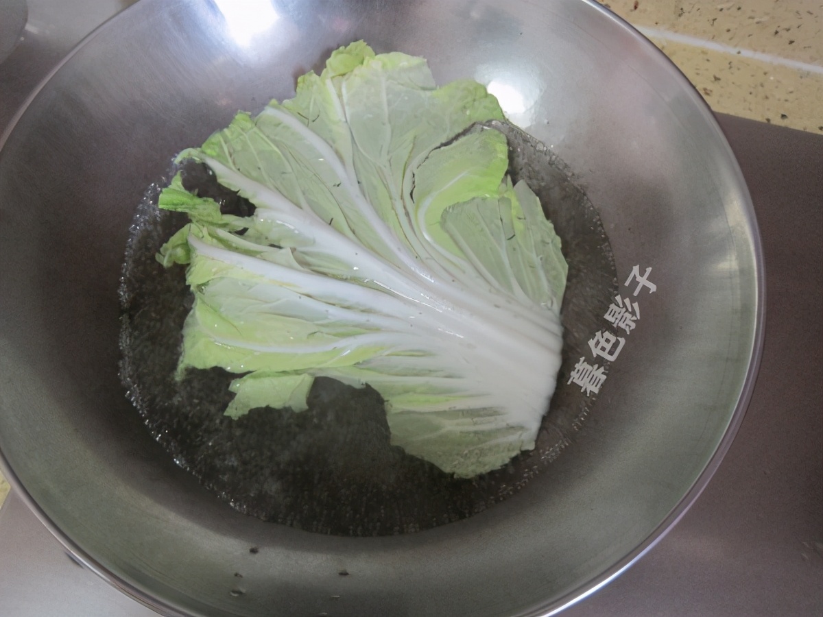 在开水里边,把白菜叶子焯个水,变色就捞出来菜帮已经软了。