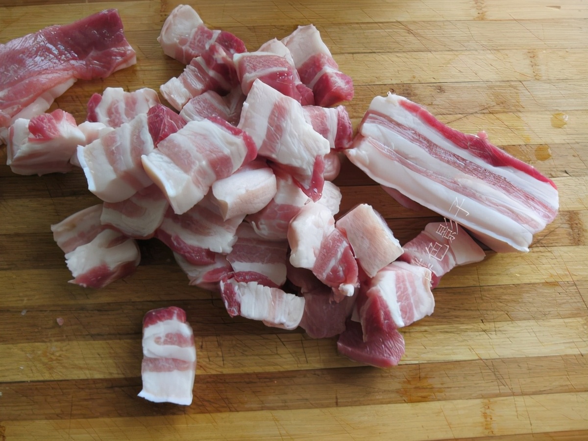 制作;新鲜的五花肉,用热水烫洗下,切成块。