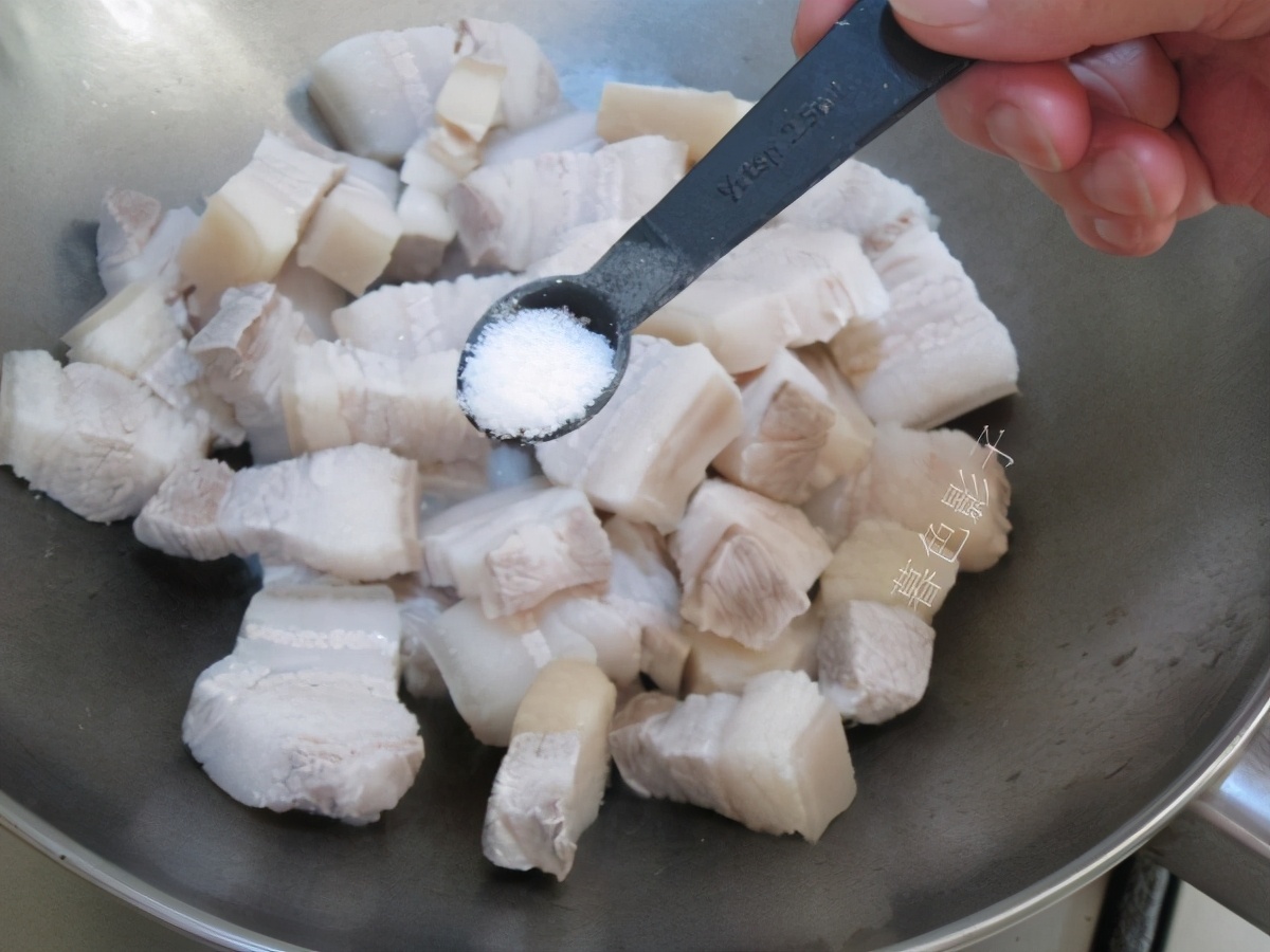 2,猪肉要用水焯一下,这样炖的肉,没有沫子,而且解腥腻。植物油热把肉放入锅内,加1勺盐。