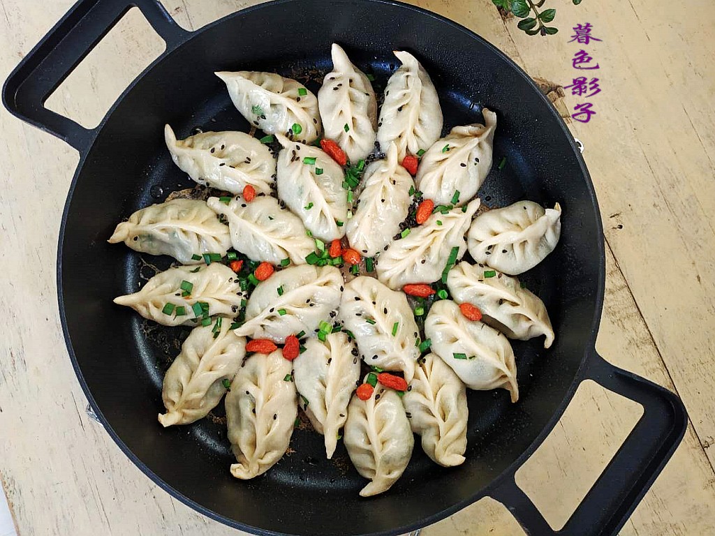 9,,盖上锅盖焖三分钟左右,注意用小火哈,锅导热很快的。煎到饺子四周的淀粉糊卷起来,关火即可吃了,保持饺子的酥脆。