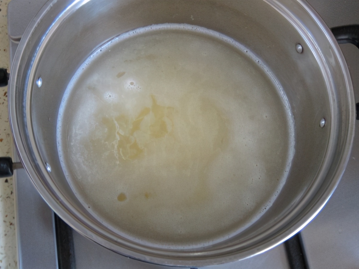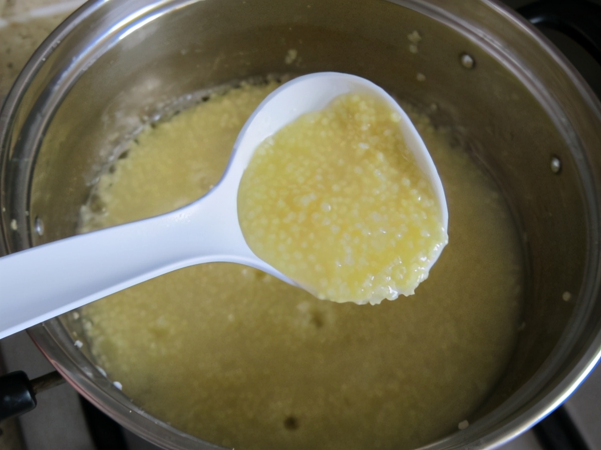 注意用勺子搅合米粥,大约煮15分钟左右,米粥变得粘稠,可以停火了。