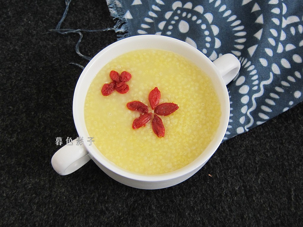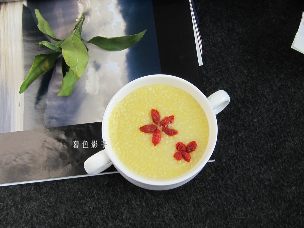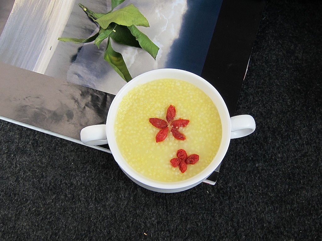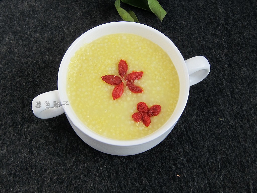 食谱;枸杞米粥。食材;东北小米1杯。枸杞适量。
