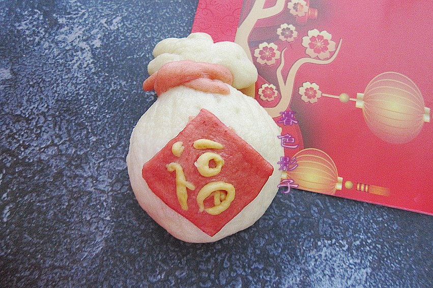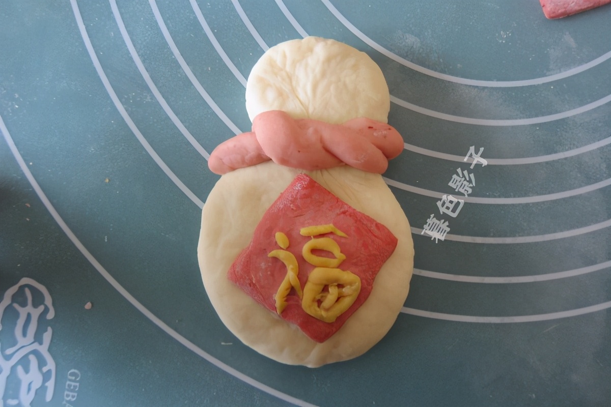 用黄色的面做个福字沾点水贴上,然后把整个福字都贴到福袋上就行了。