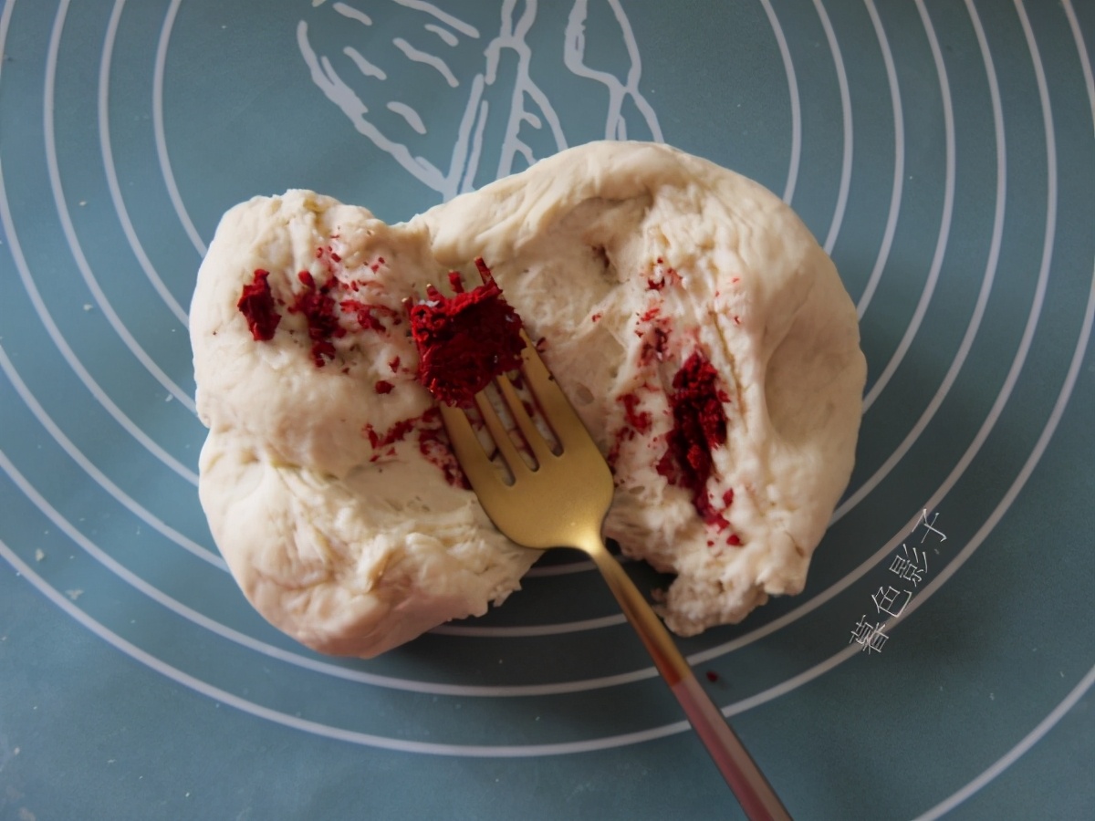 发酵好的面团,取适量的面加水红曲粉,揉搓到面团颜色发红即可,松弛一会再揉。