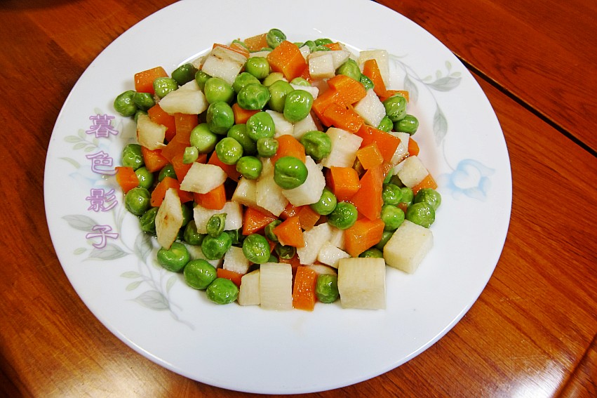 菜名;繁花似锦。素炒3丁,山药丁,豌豆,胡萝卜丁,营养搭配好吃又好看。