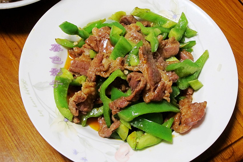 菜名;牛气冲天。牛肉片炒青椒,清脆清香的下酒菜。