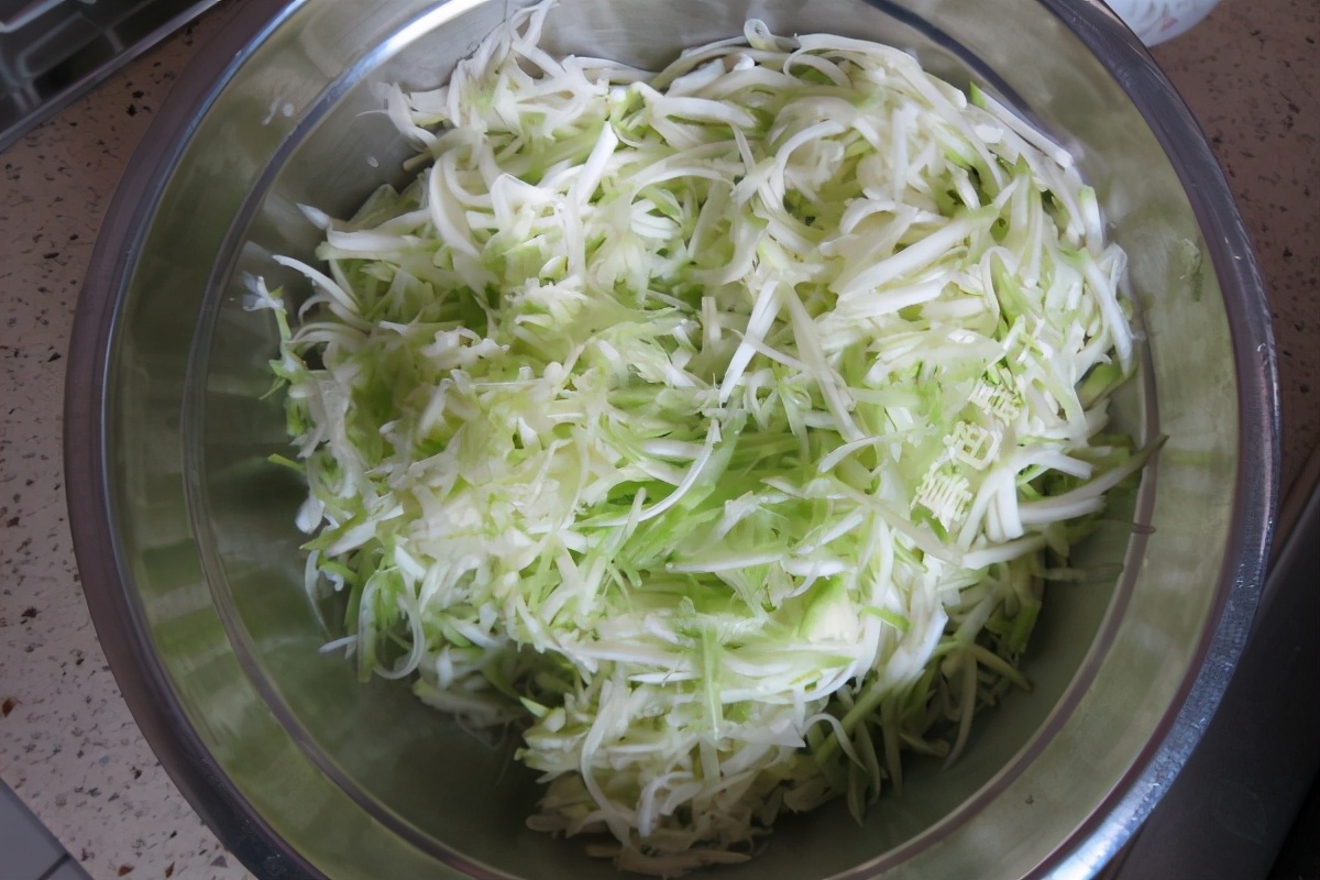 用插板把西葫芦刨成丝,如果切丝也是可以的。