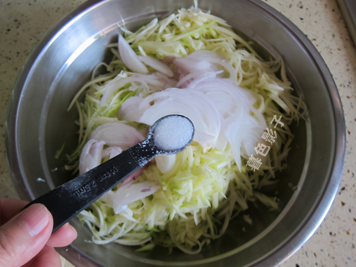 圆葱剥掉外皮,切得的时候用冷水冲洗一下,这样不会辣眼睛。