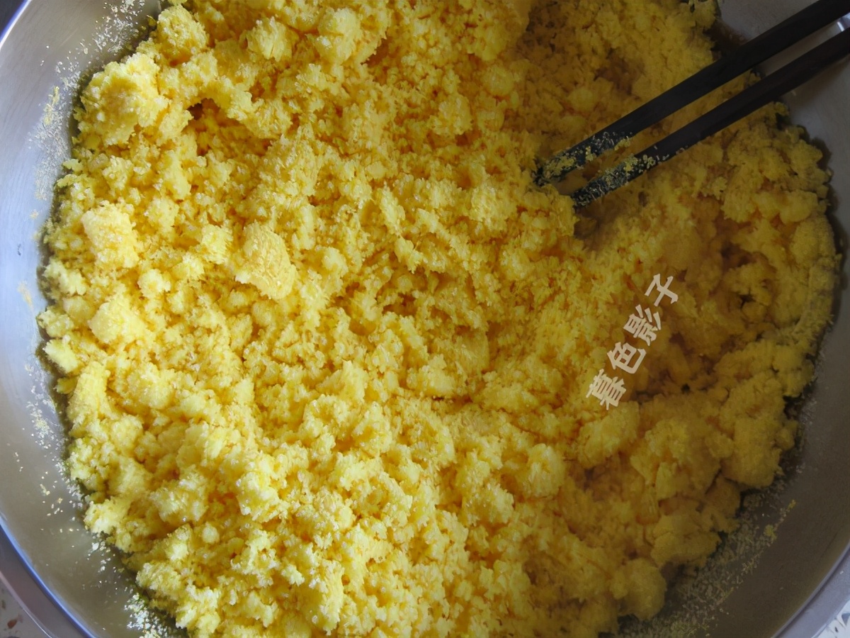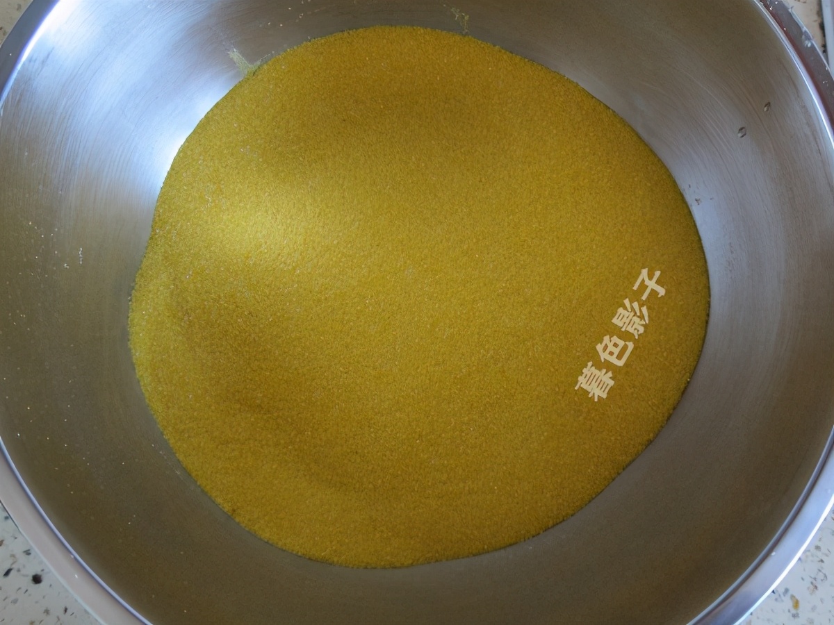 制作步骤;玉米粉放到容器里边,这玉米粉有点粗的那种,吃着更香。