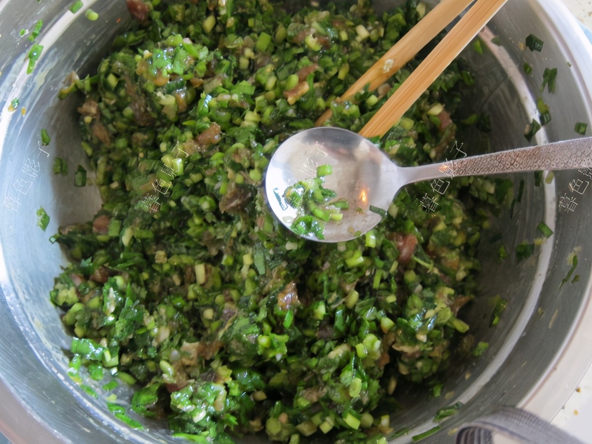 馅料;韭菜洗干净,切成碎碎的韭菜沫,肉馅需要加植物油和酱油香油和盐搅拌成泥状,包饺子之前再加韭菜一起混合,这样韭菜不容易出汤汁。