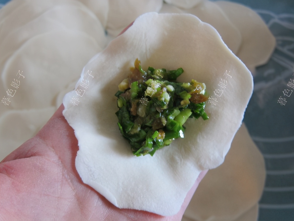 在一个饺子皮上加适量 的馅料。保持四边不要沾上馅料和油,然后双手合起来捏下就行了。