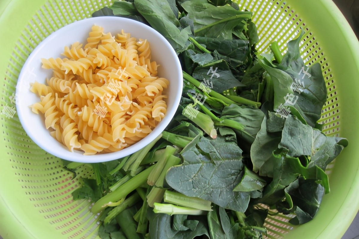 制作步骤;把主要的食材都准备好,意粉和菠菜,洗干净切成段备用