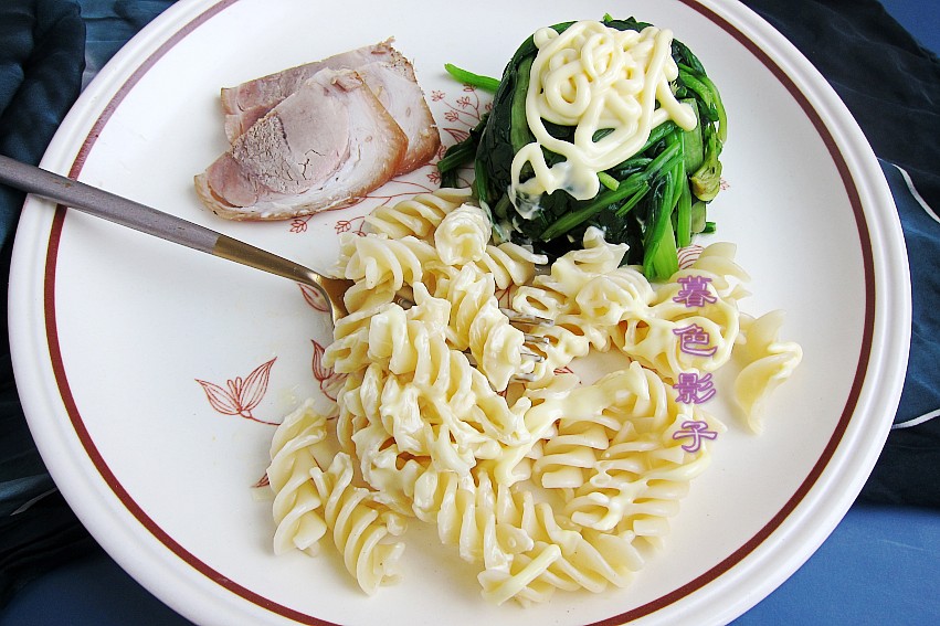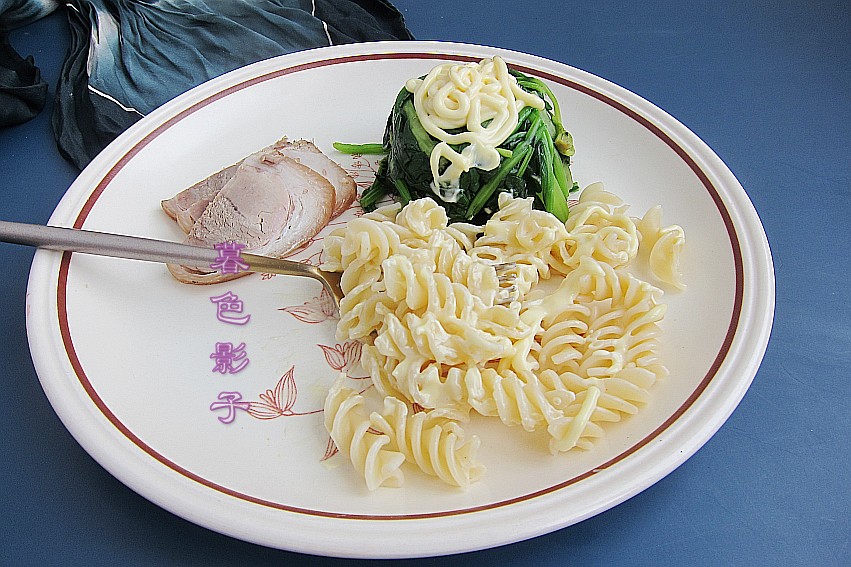 食谱;沙拉酱拌蔬菜意粉,食材;意大利面一碗,菠菜适量,沙拉酱适量,熟猪肉适量。