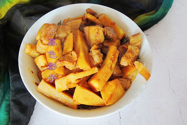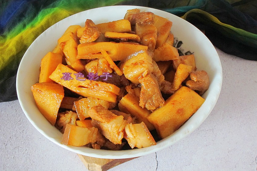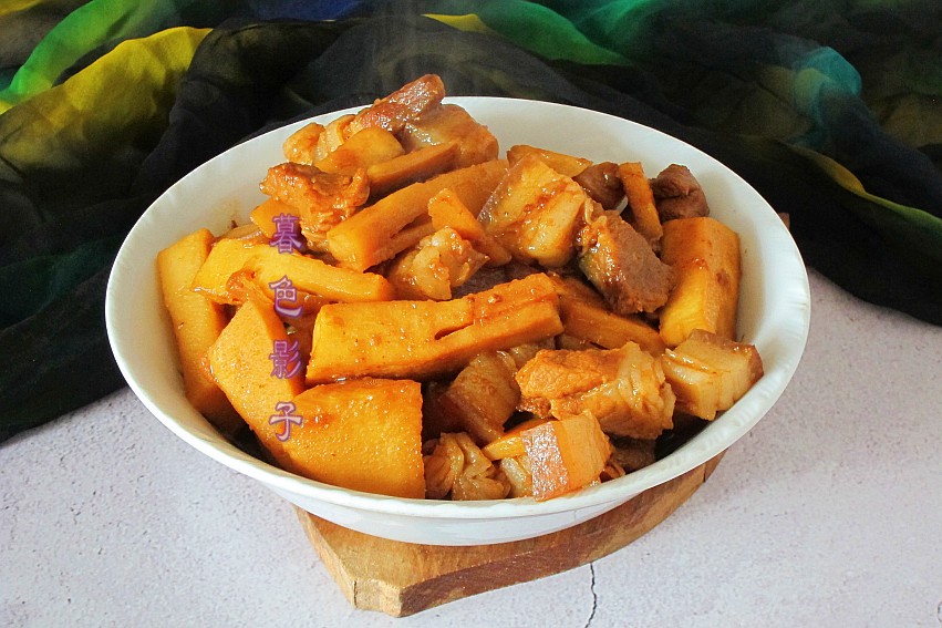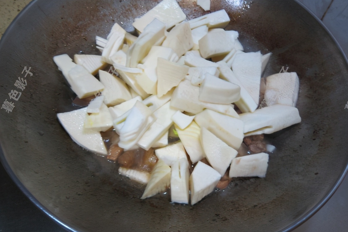 大概炖25分钟左右,肉已经软烂了,把焯水的笋块倒进锅里,小火炖15分钟左右入味即可。